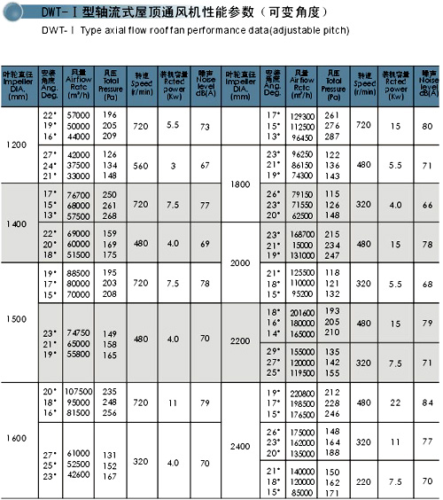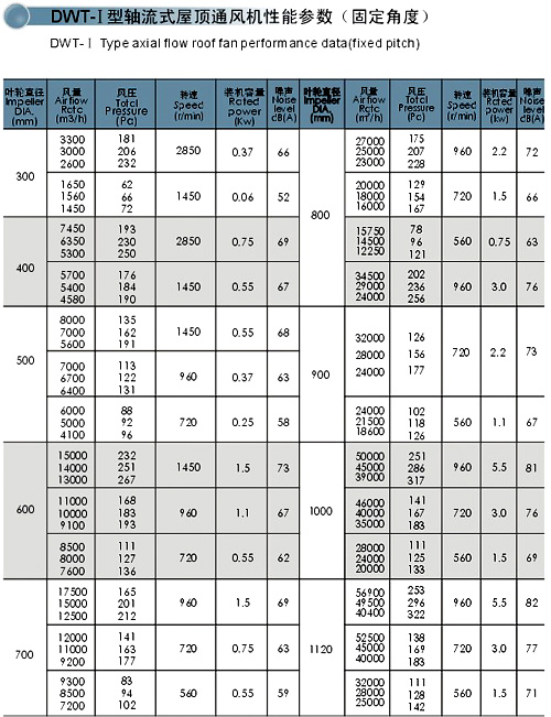 本系列屋頂風機共分三大類:①軸流式屋頂風機(DWT-I),直徑自Φ300-Φ2400mm,共十七種機號;②離心式屋頂風機(DWT-Ⅱ),有Φ300-Φ1000 mm九種機號;③混流式屋頂風機(DWT-Ⅲ),直徑自Φ280-Φ800 mm,共十種機號,還可根據用戶需要提供其它機號風機。